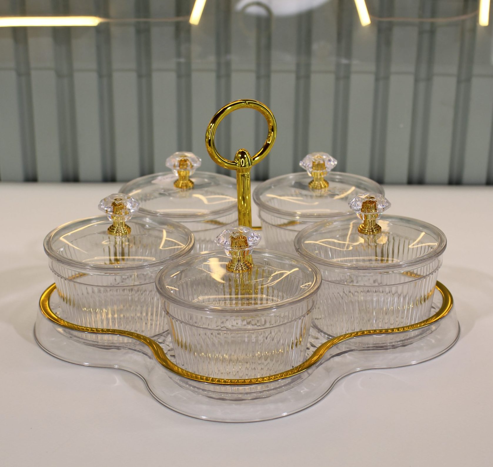شامل یک عدد استند و 5 عدد پیاله درب دار مناسب آجیل / تنقلات و …